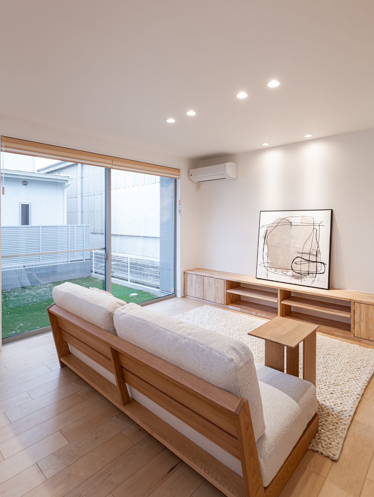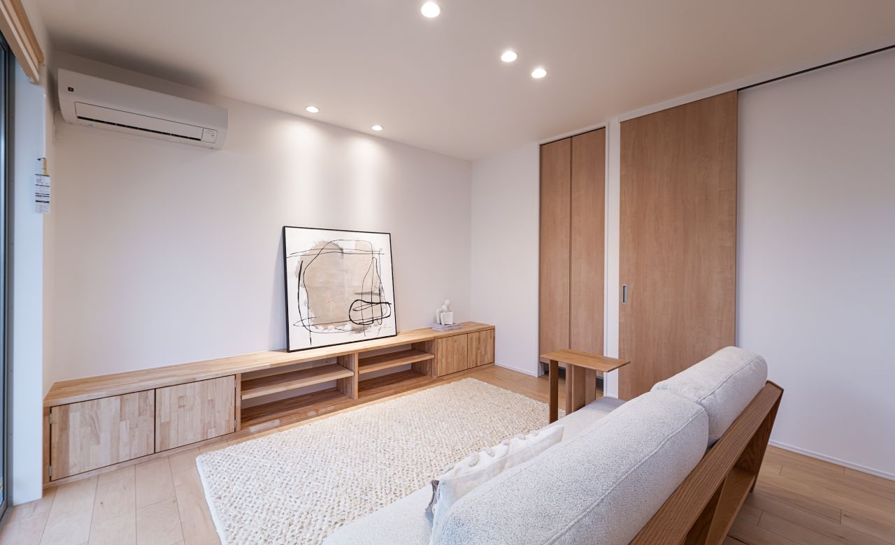 大きな掃き出し窓がリビングいっぱいに光を届け、